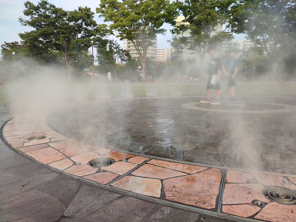 気温が高い夏はミスト量を多くし、熱中症対策を伴った子どもの水遊び場として活躍します。